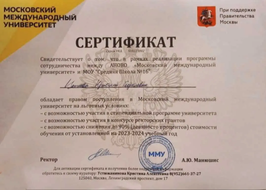 Одиннадцатиклассники получили Сертификаты, свидетельствующие о том, что, в рамках реализации программы сотрудничества между Московским международным университетом и нашей школой, наши выпускники обладают правом поступления в университет на льготных условиях.