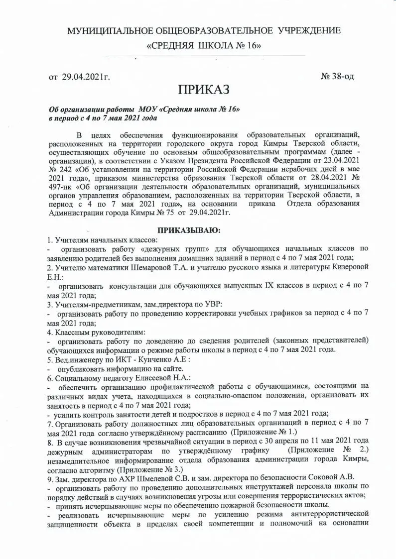 Организация работы в период с 4 по 7 мая 2021 года admin Новости 29 апреля, 2021 Приказ об организации работы в период с 4 по 7 мая 2021 года