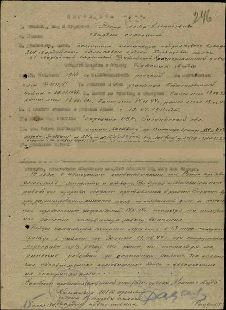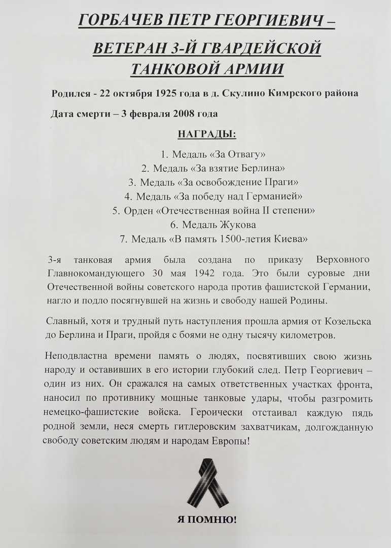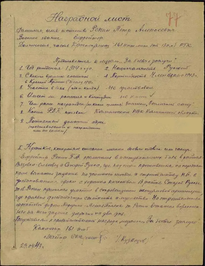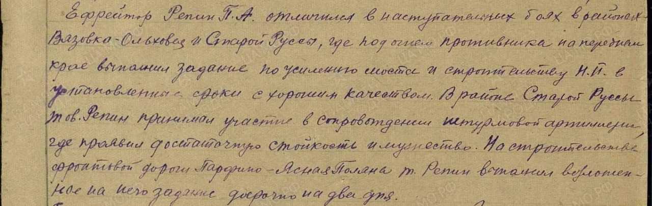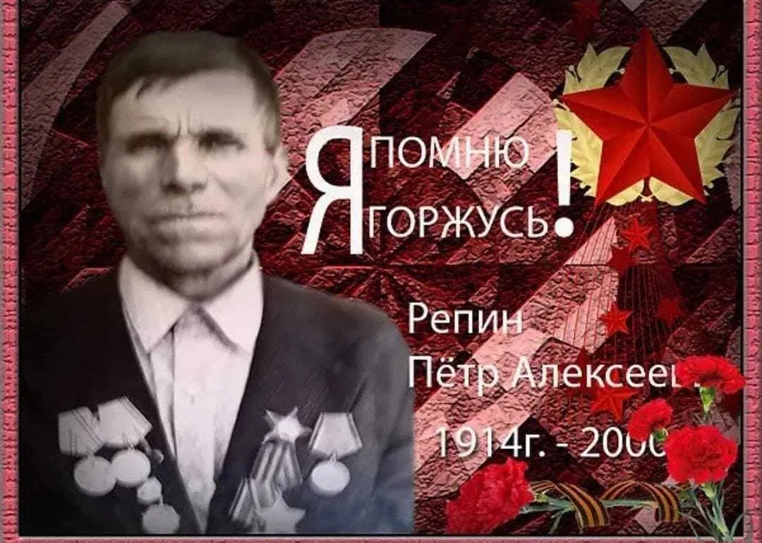 Я хочу рассказать об одном из моих прапрадедушек, его звали — Репин Петр Алексеевич. Он родился в 1914 году в деревне, получил образование, отслужил в армии. Затем встретил девушку по имени Катя, они поженились, родились дети. В 1941 году пришла страшная весть — началась Великая Отечественная война… И уже в первые месяцы войны дед оказался на фронте. Он героически сражался, освобождая свою родную землю от фашистов. Дедушка был дважды ранен. У него имеется много наград — медали «За Отвагу», «За победу над Германией», Орден Красной Звезды.