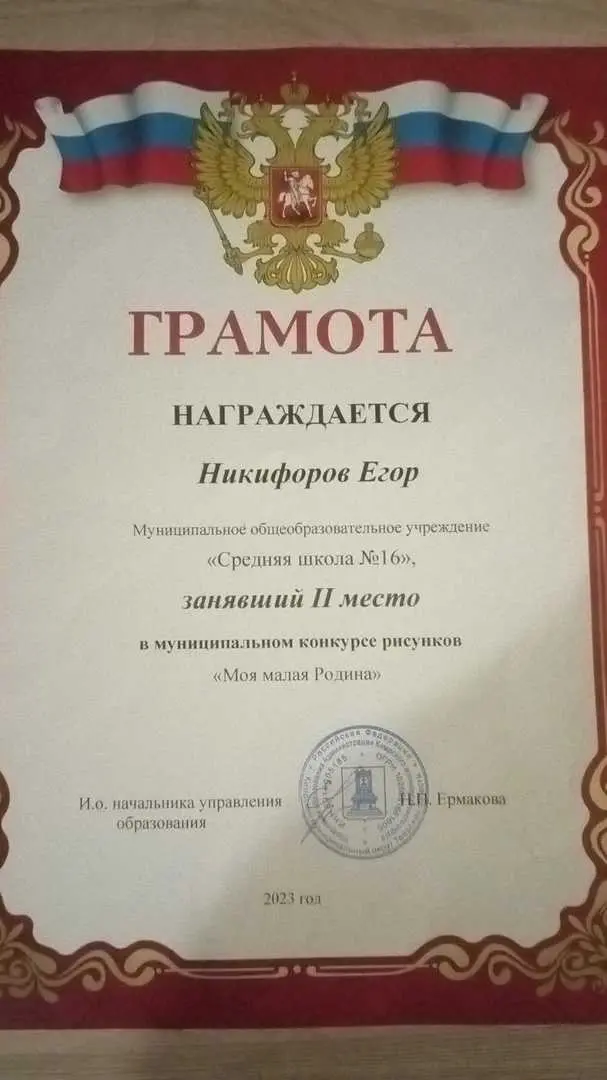 Поздравляем учащегося 3-го класса — Никифорова Егора, занявшего II место на конкурсе детского изобразительного творчества «Моя малая Родина».