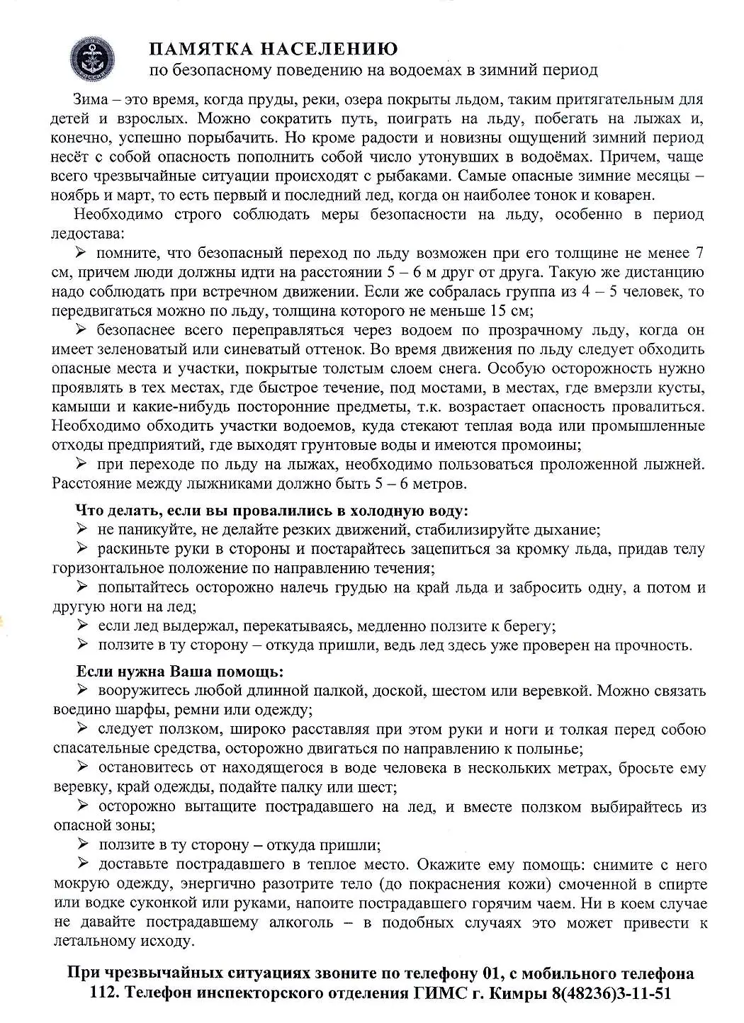 Памятка о безопасном поведении на водоемах в зимний период admin Новости 24 января, 202124 января, 2021 ПАМЯТКА НАСЕЛЕНИЮ по безопасному поведению на водоемах в зимний период