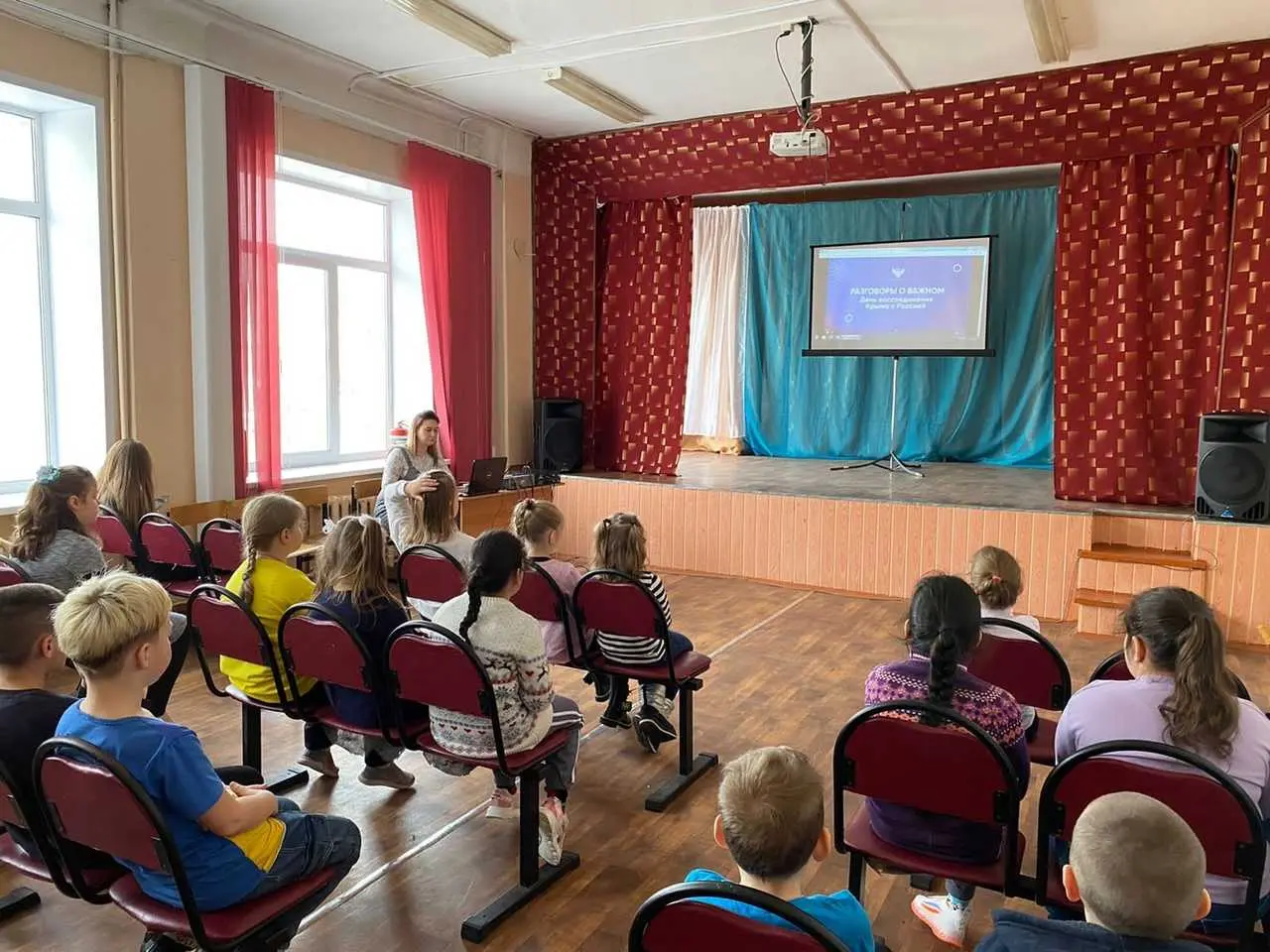 20.03.2023, в первый день работы школьного лагеря «Солнышко», занятия курса внеурочной деятельности «Разговоры о важном» прошли на тему «День воссоединения Крыма с Россией». Обучающиеся узнали об исторических событиях, связанных с воссоединением русского Крыма с Россией. Обсуждались причины и значение воссоединения России и Крыма, понятие «Русская весна».